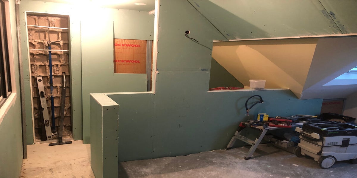 Travaux d’aménagement intérieur : cloisonnement, faux plafonds, remplacement de Velux et portes.